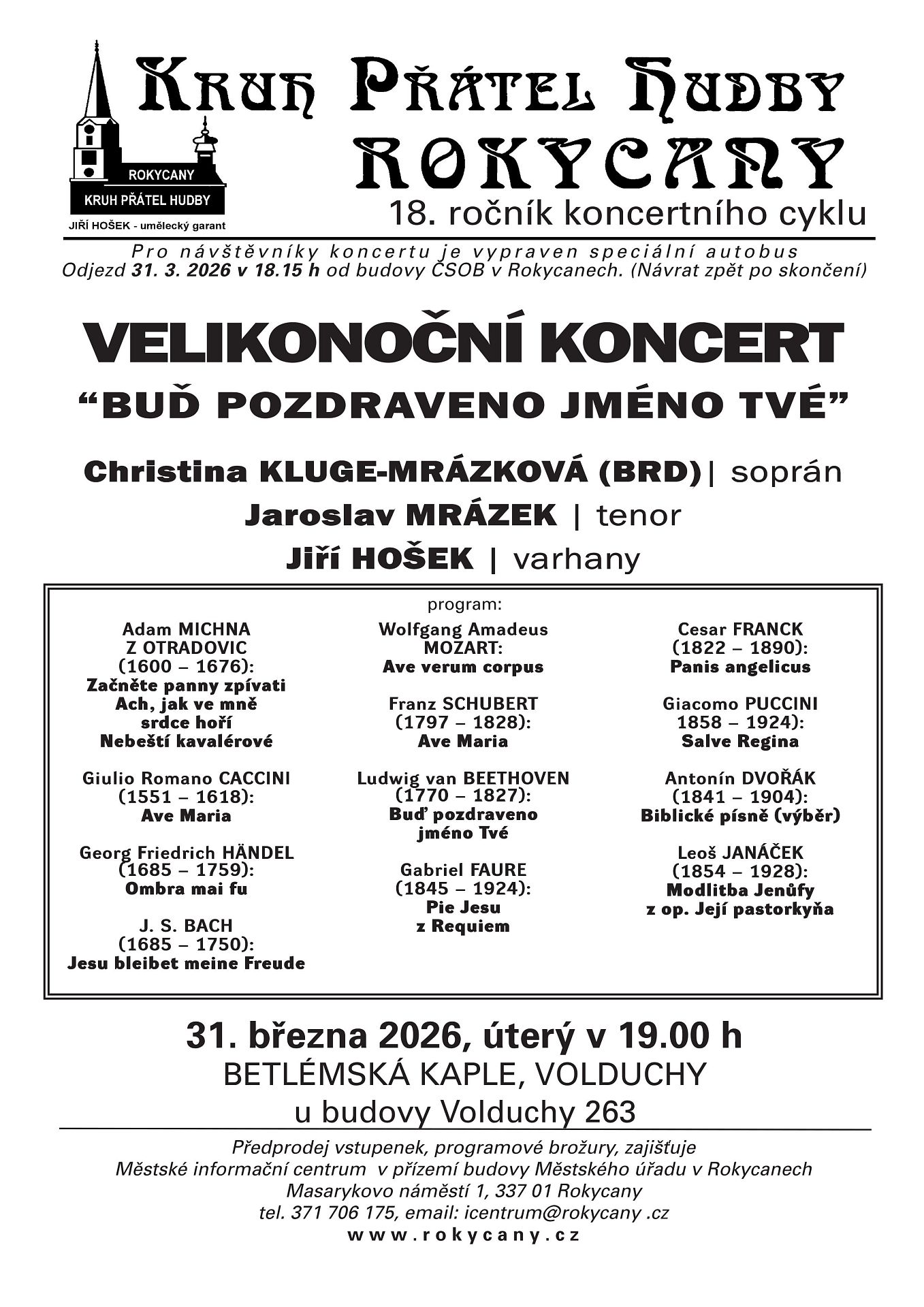 Klub přátel hudby Rokycany pořádá Velikonoční koncert "Buď pozdraveno jméno Tvé" dne 31.3.2026 od 19h v Bétlémské kapli ve Volduchách.